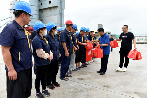 8月6日下午,招遠(yuǎn)市總工會黨組書記、常務(wù)副主席王利亭等一行4人到山東金潮股份公司旗下子公司——山東招和環(huán)保建材有限責(zé)任公司戶外工作現(xiàn)場,為堅(jiān)守在烈日和高溫下的一線職工發(fā)放內(nèi)裝茶葉、礦泉水的 “消暑禮包”,并致以親切的慰問。