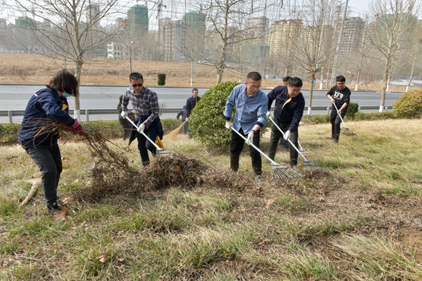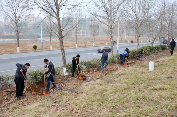 3月12日植樹節(jié)當(dāng)天,按照前期劃定的區(qū)域,金潮控股總部組織行政人事中心、財(cái)務(wù)中心,金潮新材、金潮建工、金潮地產(chǎn)公司干部員工打響了集中清理環(huán)境衛(wèi)生的突擊戰(zhàn)。在公司總部院內(nèi)及大門兩側(cè)綠化帶的大樹下、草坪及花壇等區(qū)域,參與活動(dòng)的干部員工自備鐵锨、筢子、抓鉤、鎬頭、篷布、編織袋等工具,集中清理散布在其中的枯枝、落葉、雜草、塑料袋等垃圾,活動(dòng)現(xiàn)場(chǎng)你追我趕、熱火朝天。經(jīng)過三個(gè)多小時(shí)的不懈努力,將旮旮旯旯的垃圾全部清除完畢,整個(gè)園區(qū)面貌為之煥然一新。與此同時(shí),金潮建工園林綠化部門的員工還及時(shí)將苗木運(yùn)抵現(xiàn)場(chǎng),并整齊有序地?cái)[放在相應(yīng)的位置。這一系列的前期準(zhǔn)備工作,為次日的植樹綠化創(chuàng)造了有利條件。