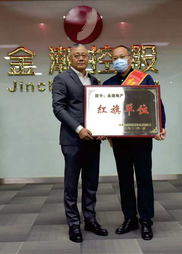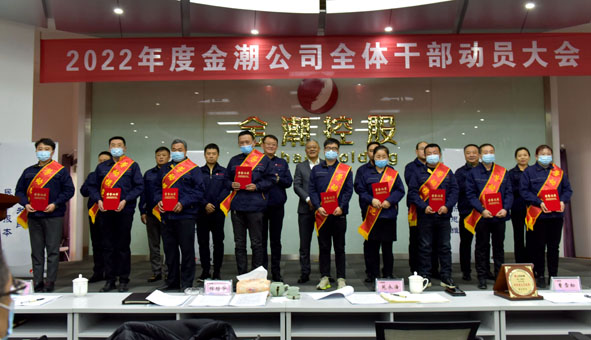 公司行政人事負(fù)責(zé)人王璐首先宣讀了“2021年度特殊重大貢獻(xiàn)獎(jiǎng)、紅旗單位、先進(jìn)團(tuán)隊(duì)、勞動(dòng)模范、優(yōu)秀干部、先進(jìn)工作者的表彰決定”。隨后,公司董事長(zhǎng)程紹華宣讀了“關(guān)于對(duì)曹雪松特殊重大貢獻(xiàn)獎(jiǎng)表彰的通報(bào)”,并依次為特殊重大貢獻(xiàn)獎(jiǎng)獲得者曹雪松、紅旗單位獲得企業(yè)金潮地產(chǎn)公司頒獎(jiǎng)并合影。伴隨著歡快的《步步高》樂曲,公司領(lǐng)導(dǎo)先后為獲獎(jiǎng)的先進(jìn)團(tuán)隊(duì)和先進(jìn)個(gè)人頒發(fā)了獎(jiǎng)狀和證書。1時(shí)48分,在熱烈的掌聲中,總裁程紹華作了題為《風(fēng)雨同舟鑄輝煌 和衷共濟(jì)創(chuàng)未來》的2022年度金潮公司全體干部動(dòng)員大會(huì)報(bào)告(全文已發(fā))。簡(jiǎn)要回顧一年來公司的主要工作亮點(diǎn),明確了2022年改革發(fā)展的方向和思路,對(duì)各企業(yè)“合伙制”團(tuán)隊(duì)提出了九項(xiàng)建議和要求,并展望了未來金潮改革發(fā)展的美好前景。