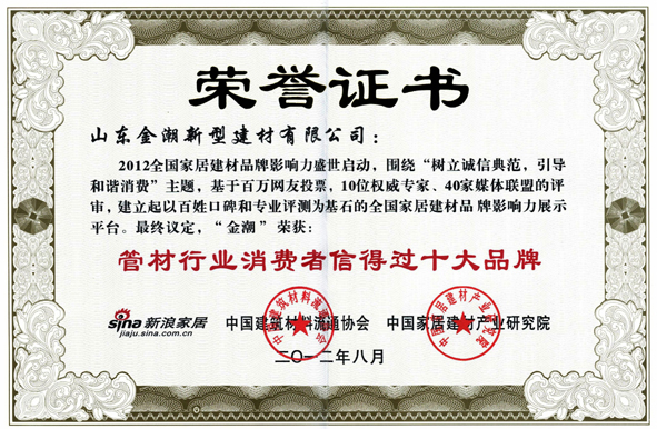Sk金潮管業(yè)榮膺全國管材行業(yè)“2012年消費(fèi)者信得過十大品牌”